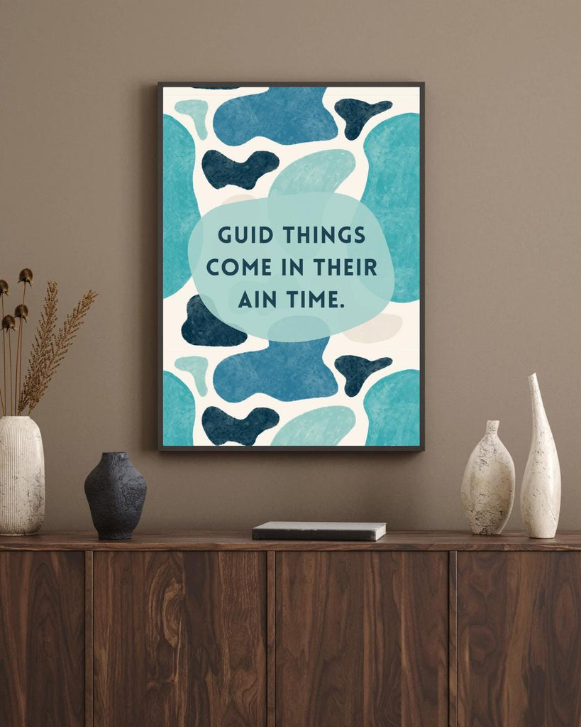 Add warmth, encouragement and a touch of Scottish charm to your home with this “Guid Things Come In Their Ain Time” art print. Featuring a calming blue and teal abstract pattern with modern typography, this Scottish affirmation print is a gentle reminder that good things arrive when the time is right.