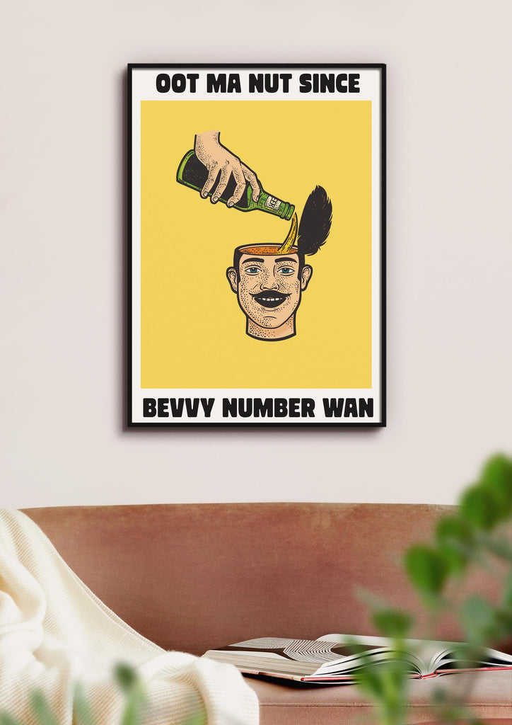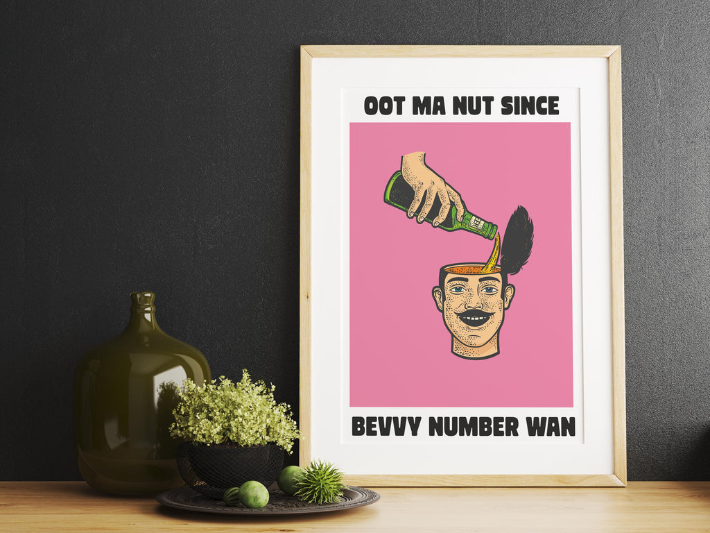 a framed illustration of a man's head with a bottle pouring liquid into it, accompanied by the text "OOT MA NUT SINCE BEVVY NUMBER WAN".